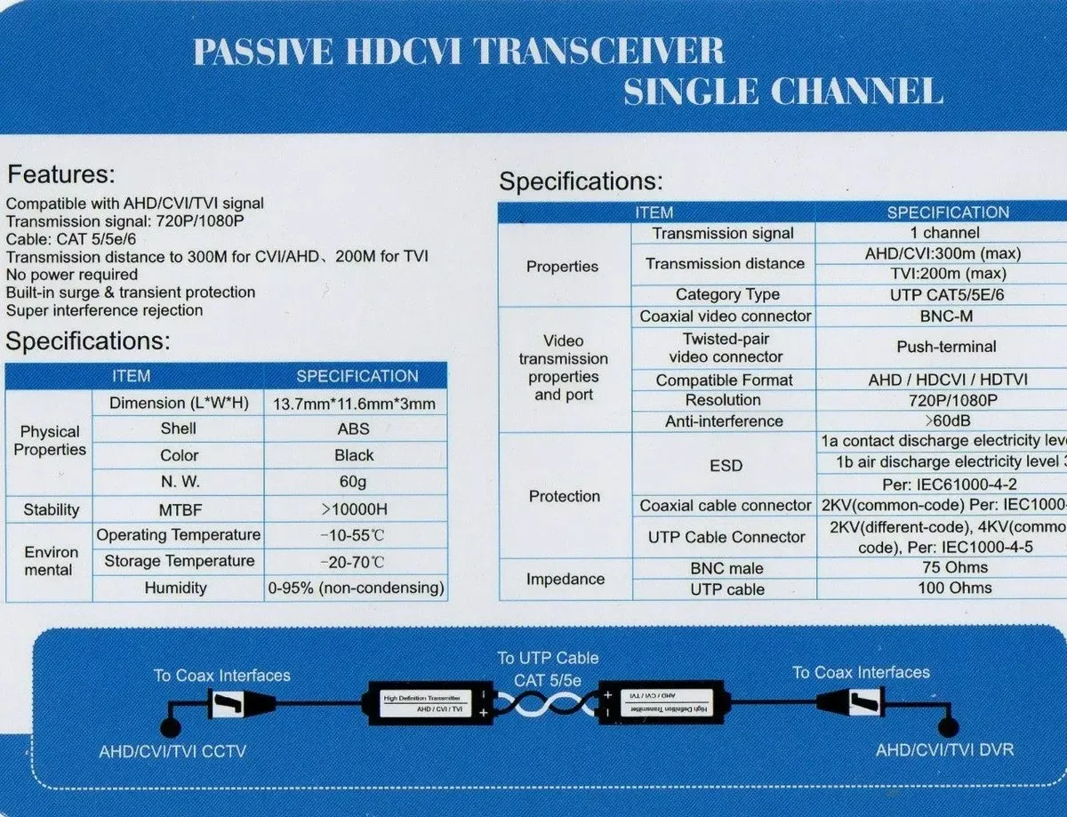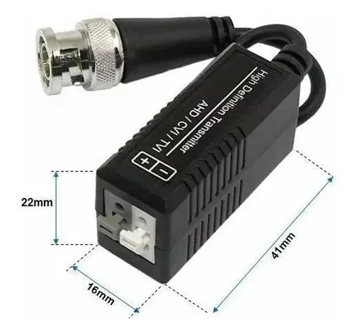 Balun pasivo para sistemas de videovigilancia analógica en alta definición (HD 1080p). Permite transmitir señal de video a través de cable UTP (par trenzado), optimizando costos de instalación sin pérdida de calidad. Ideal para cámaras y DVR con formato TVI, CVI, CVBS y AHD.