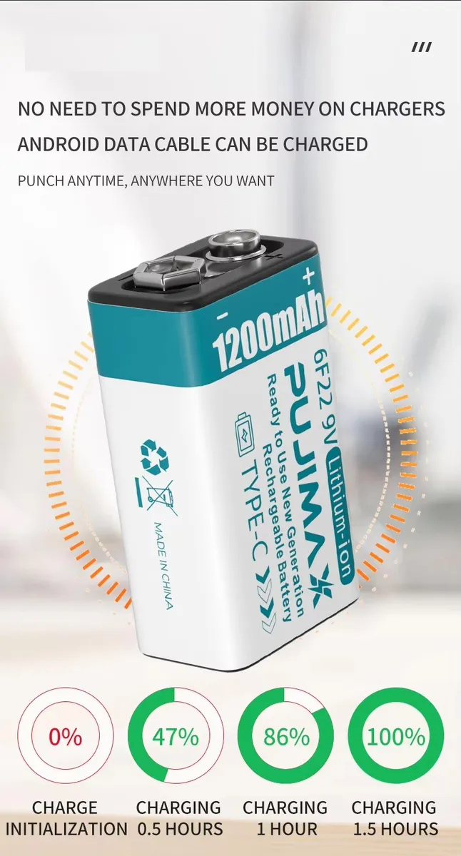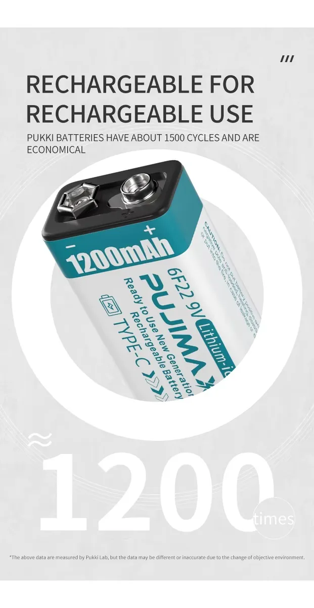 Haz tu energía más eficiente con esta batería recargable de litio 9V con carga USB-C, diseñada para ofrecer mayor duración y reutilización en comparación con baterías convencionales. Con capacidad de 1200mAh, es ideal para dispositivos como micrófonos, testers, controles, juguetes, detectores, instrumentos eléctricos y equipos electrónicos.