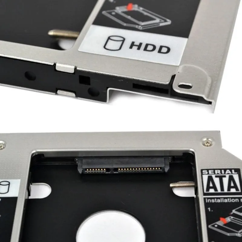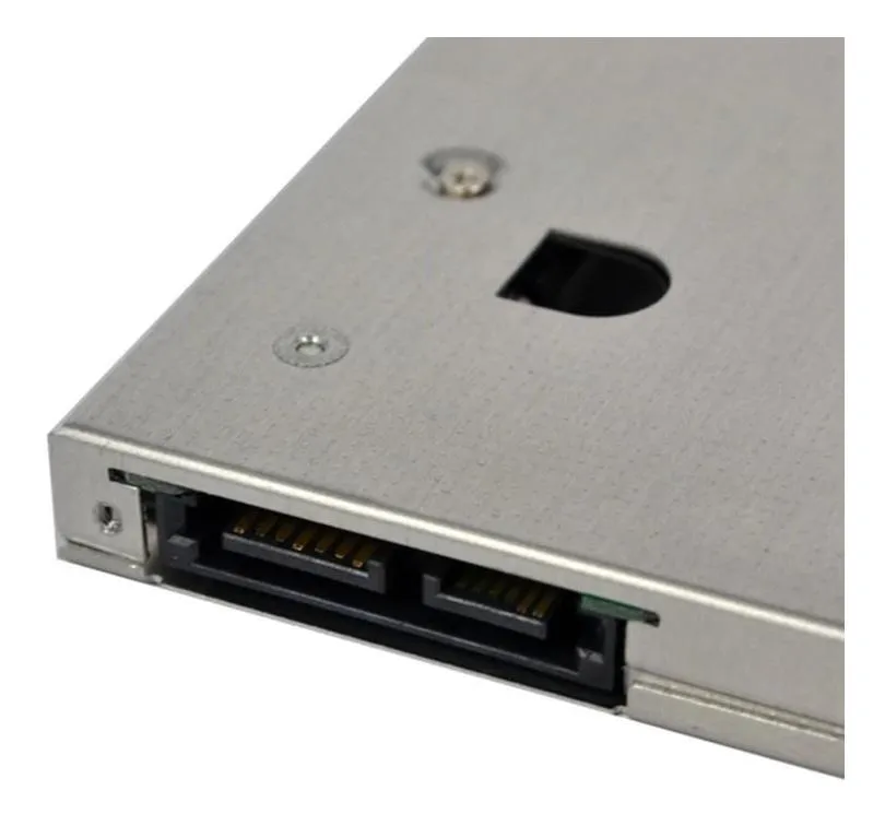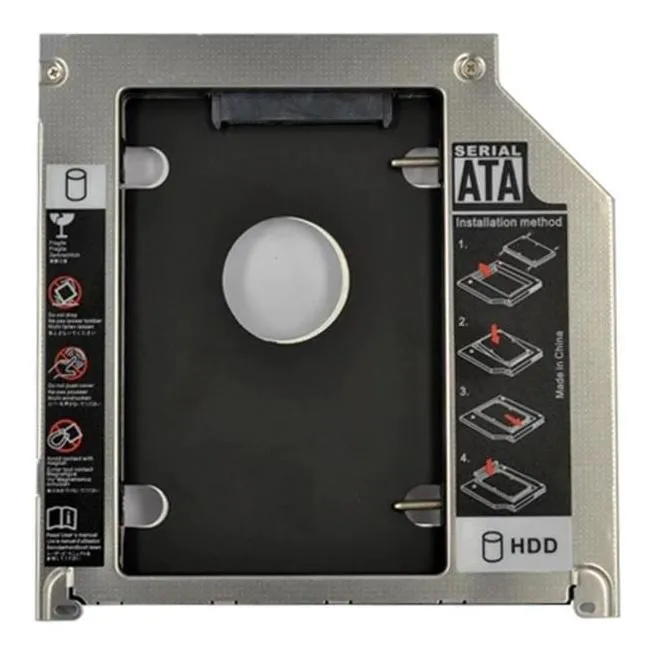 Caddy adaptador 9.5mm para notebooks. Permite reemplazar el lector de CD/DVD por un disco HDD o SSD adicional, mejorando rendimiento y almacenamiento.