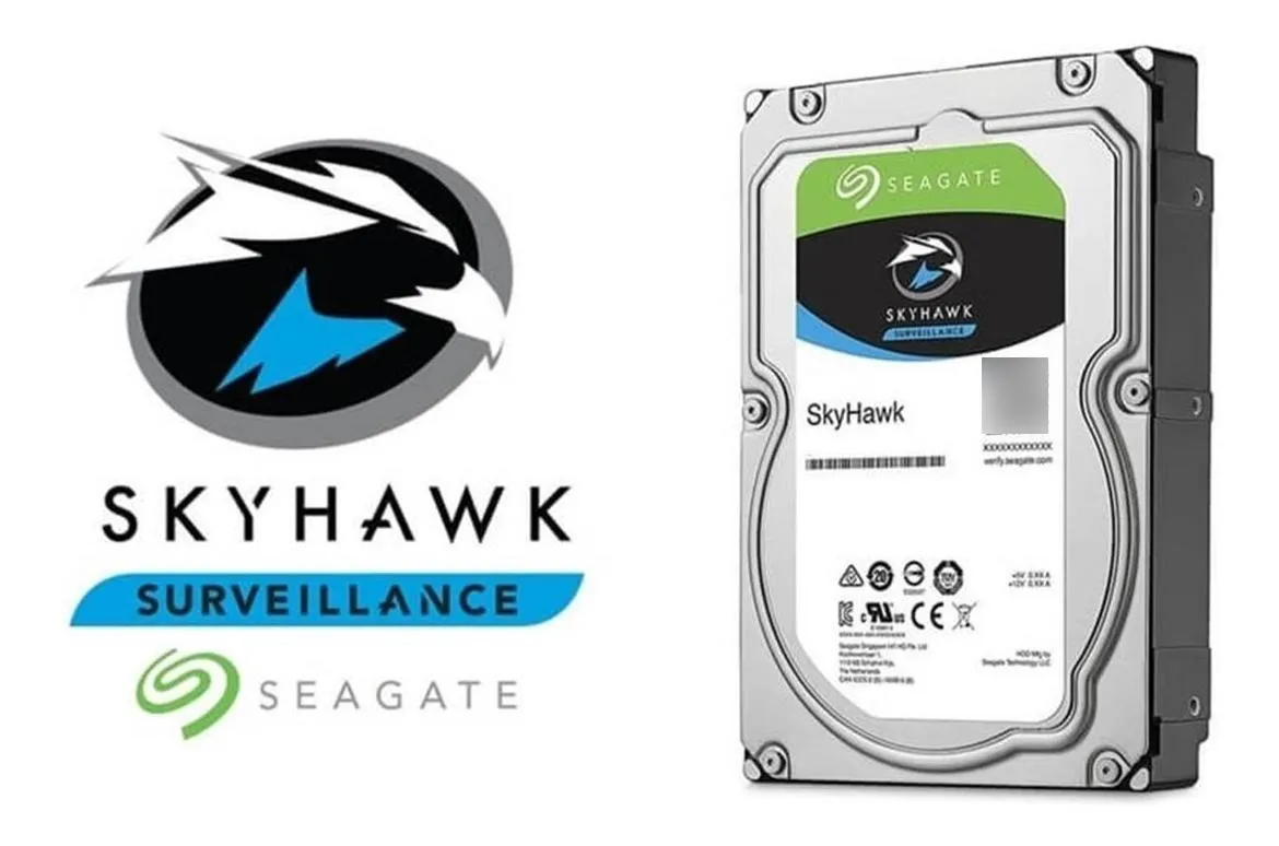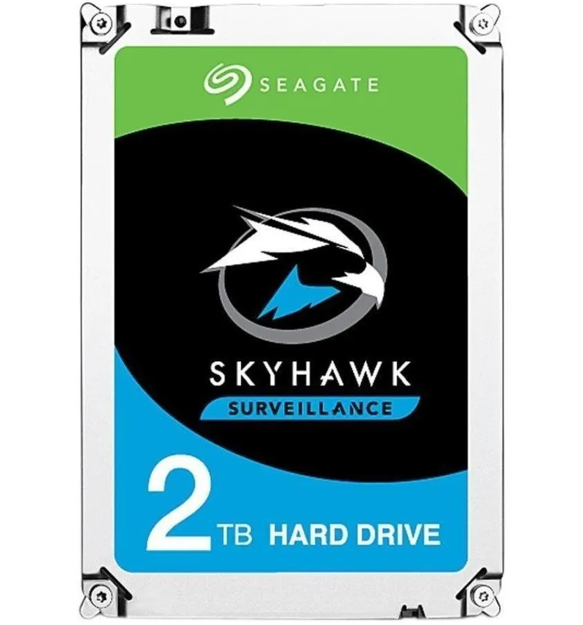 Disco duro interno Seagate SkyHawk de 2 TB, modelo ST2000VX008. Este disco está diseñado específicamente para sistemas de videovigilancia (DVR/NVR) y grabación de video ininterrumpida las 24 horas del día, los 7 días de la semana.