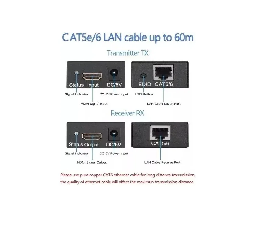 Extiende hdmi hasta 60 metros a través de un cable UTPO unifilar Cat6 o cat6e en 100% cobre, sin cortes, sin interrupción de transmisión de datos.