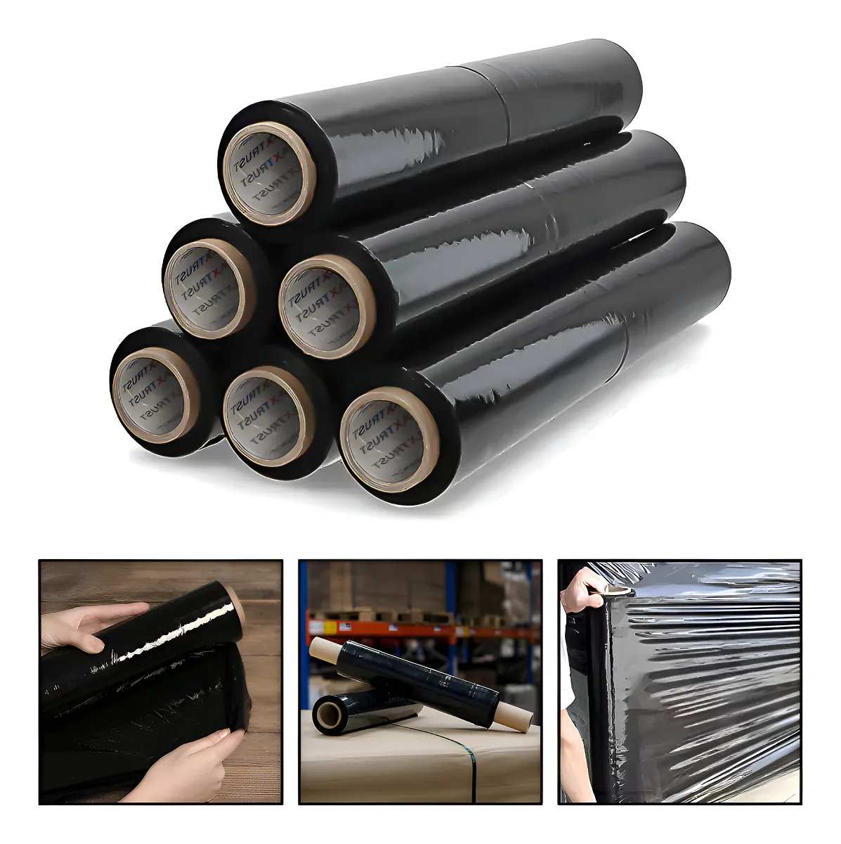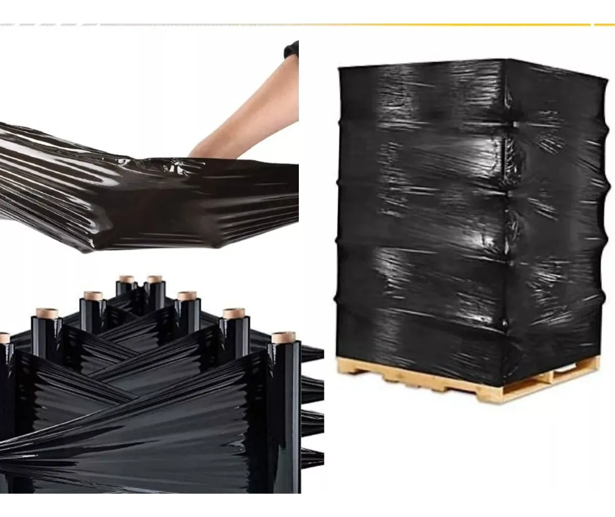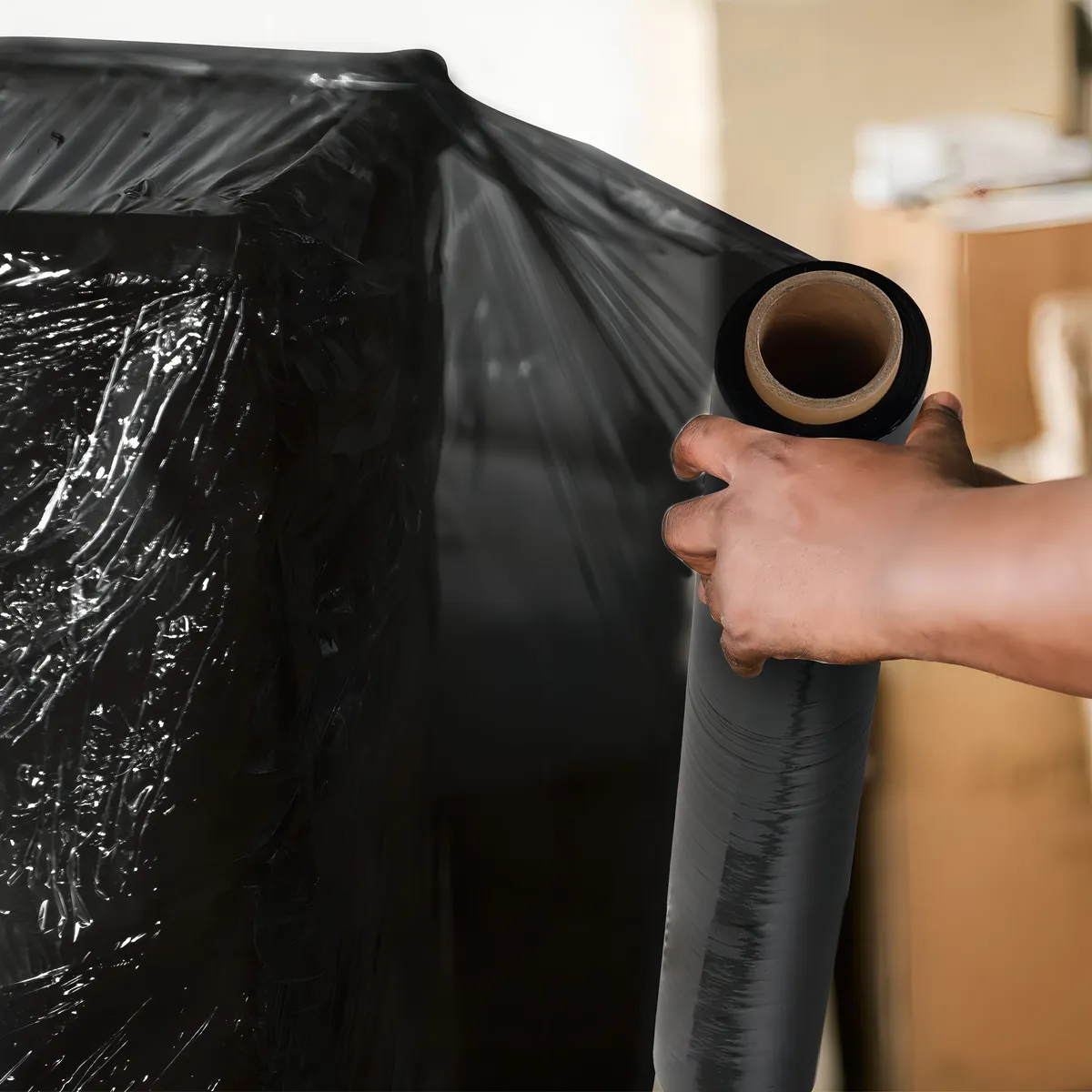 El Film Stretch Negro es un material plástico altamente elástico empleado para envolver y resguardar diversos productos. Su tonalidad oscura contribuye a preservar los productos de la exposición solar, la cual podría deteriorar ciertos artículos, como alimentos y dispositivos electrónicos.