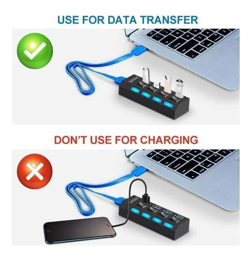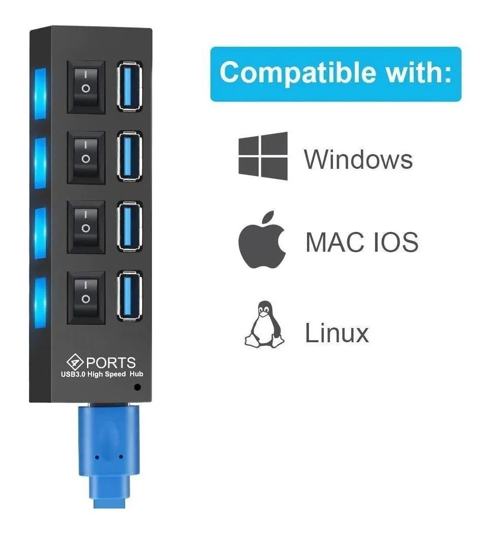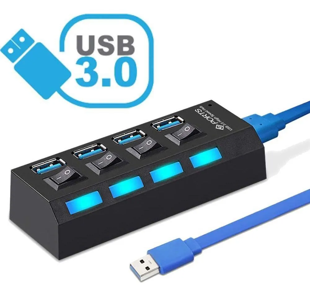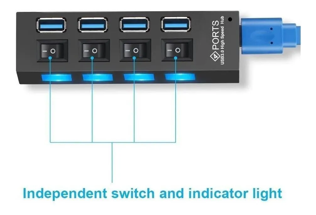 Amplía las conexiones USB de tu PC o notebook con este hub de alta velocidad USB 3.0, ideal para periféricos como mouse, teclados, pendrives, discos externos, lectores de tarjetas y más. Cada puerto incluye interruptor independiente con luz LED, permitiendo activar o desactivar dispositivos sin desconectarlos físicamente.