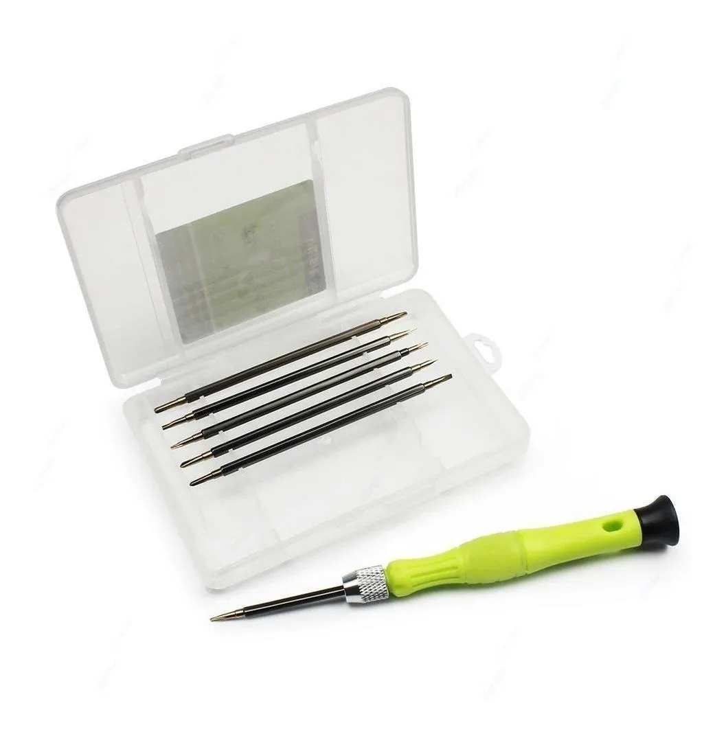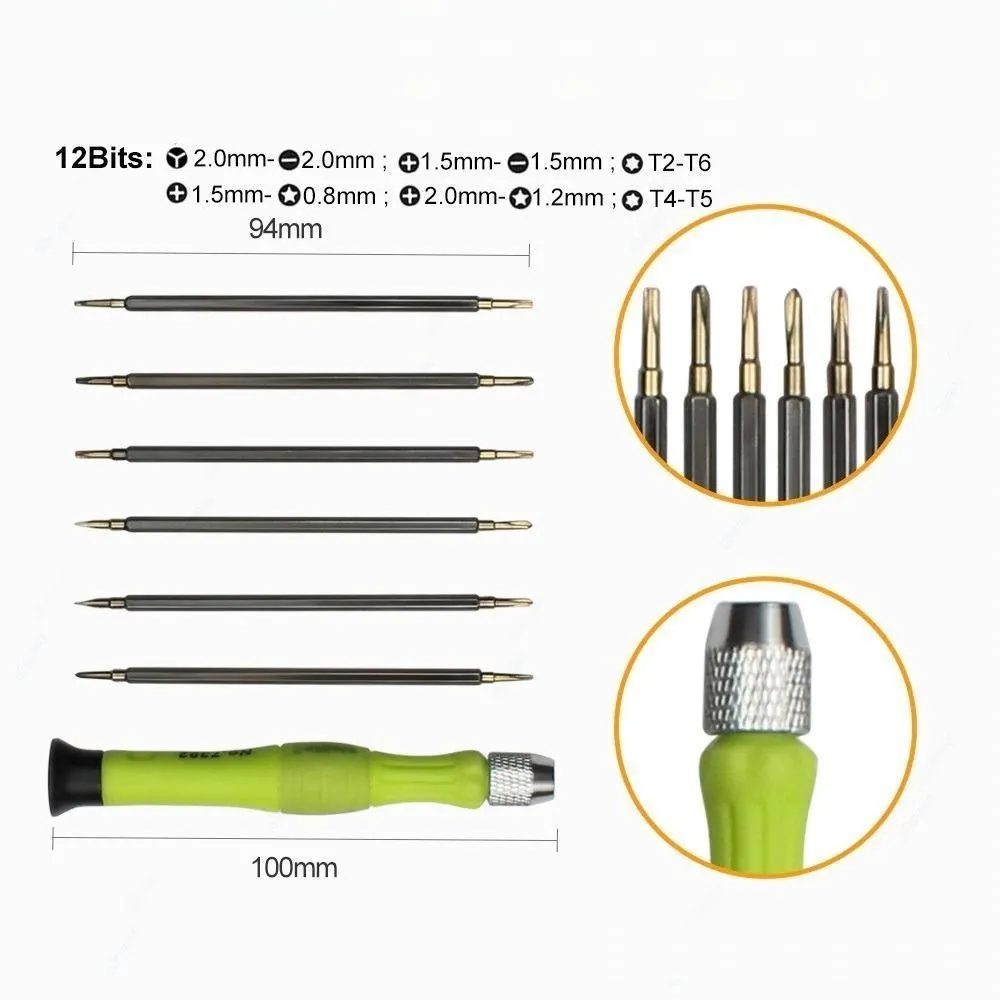 El Kit Destornillador 6 en 1 Profesional incluye 12 puntas de precisión intercambiables (Phillips, Torx, Pentalobe, Tri-wing, ranurado y más) fabricadas en acero S2 de alta dureza que no se desgastan ni redondean. Perfecto para abrir iPhone, Samsung, Huawei, MacBook, PS4, PS5, Xbox, Nintendo Switch, drones y cualquier dispositivo electrónico.