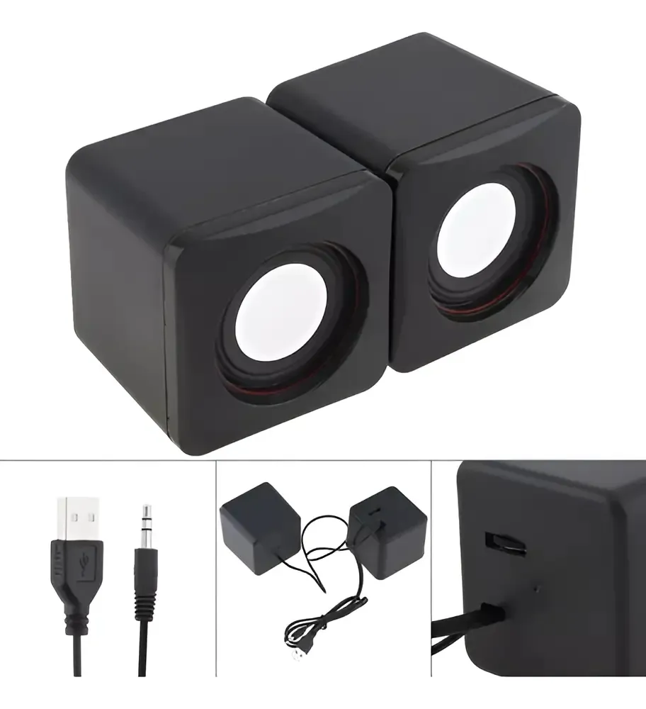 Parlantes estéreo para PC o notebook con conexión USB para alimentación y conector de audio 3.5mm, ideales para teletrabajo, estudio o entretenimiento. Ofrecen potencia RMS total de 3W (1,5W por bocina), diseño compacto tipo caja y fácil instalación: solo conectas el USB y el plug de audio y comienzan a funcionar. No incluyen batería recargable ni luces LED, por lo que son simples, livianos y portátiles. Una solución económica para mejorar el sonido integrado de tu computador sin ocupar demasiado espacio en el escritorio.