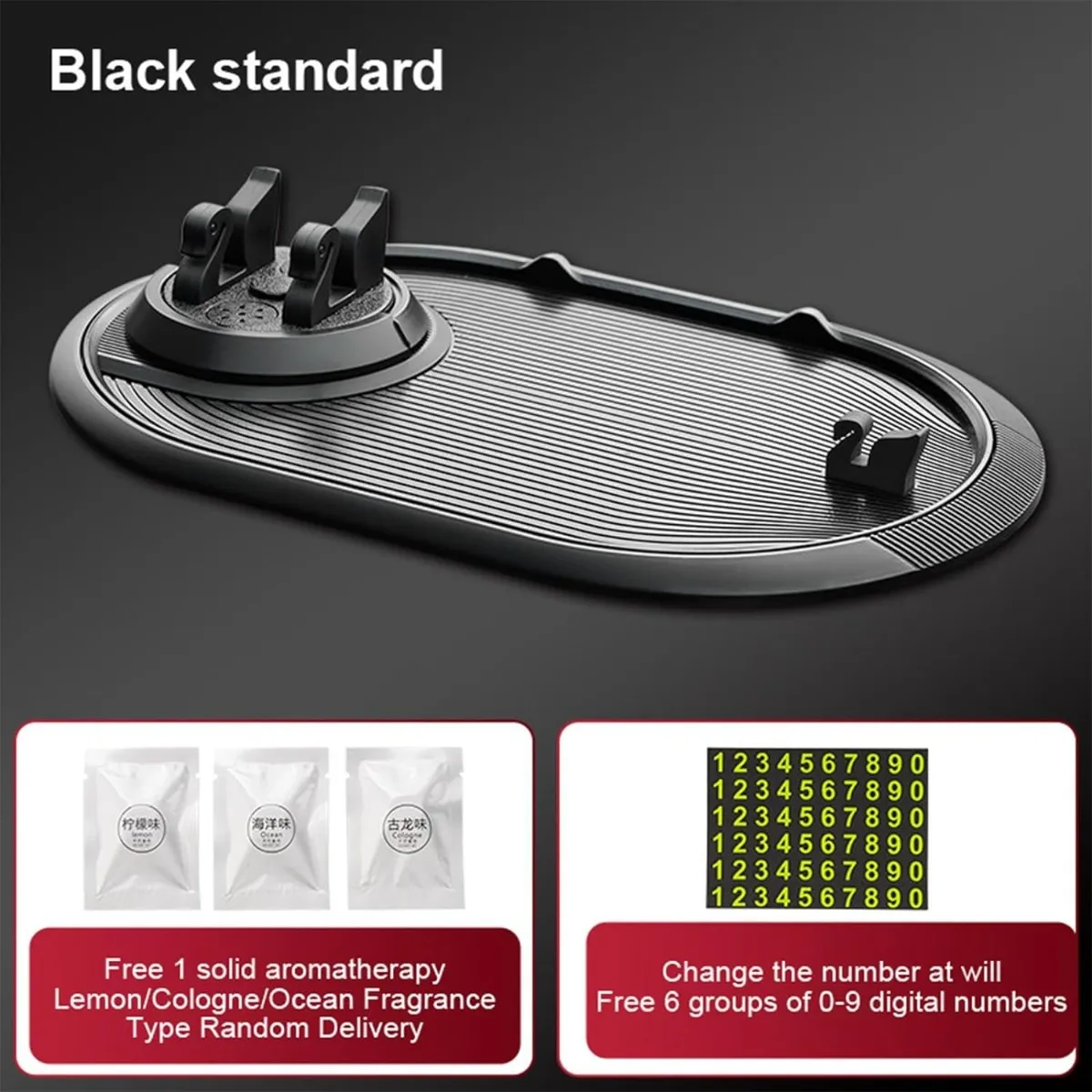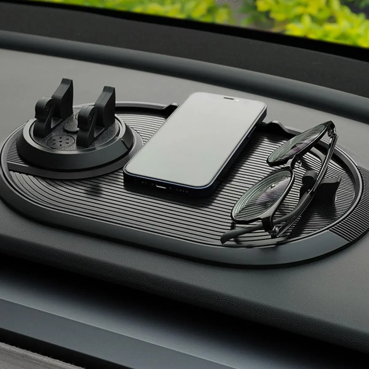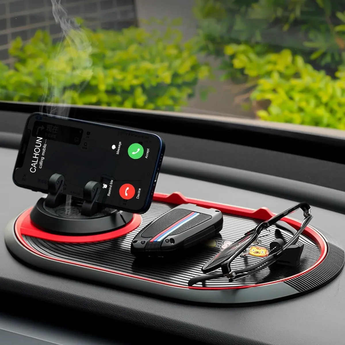 Este soporte antideslizante es un accesorio versátil y elegante para su auto. Tiene ondas agua que evitan que tus artículos se deslicen. También tiene una función rotación 360° que te permite ajustar el ángulo a tu gusto. Puedes colocar tu perfume en la bandeja y disfrutar la función aroma. También tiene un clip fijo para gafas que mantiene tus gafas seguras y a mano.