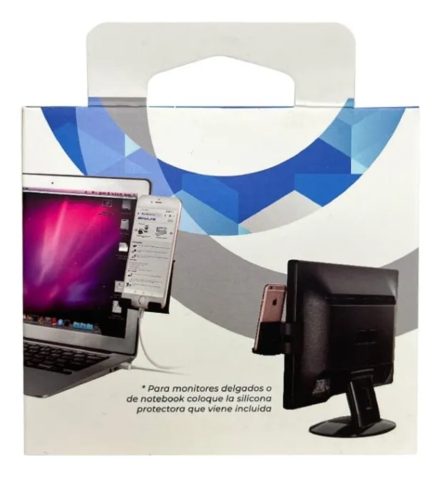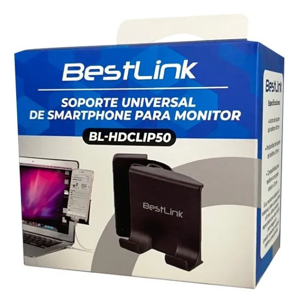 Soporte universal modelo BL-HDCLIP50 para monitores o pantallas. Especial para poder visualizar su teléfono mientras trabaja frente al computador. Entrega un gran ángulo de visión ajustable horizontal. Su clip se ajusta a la mayoría de los monitores y viene con una tapa de silicona para monitores mas delgados. Se puede utilizar a ambos lados del monitor y entrega un espacio para conectar el cable de carga al teléfono.