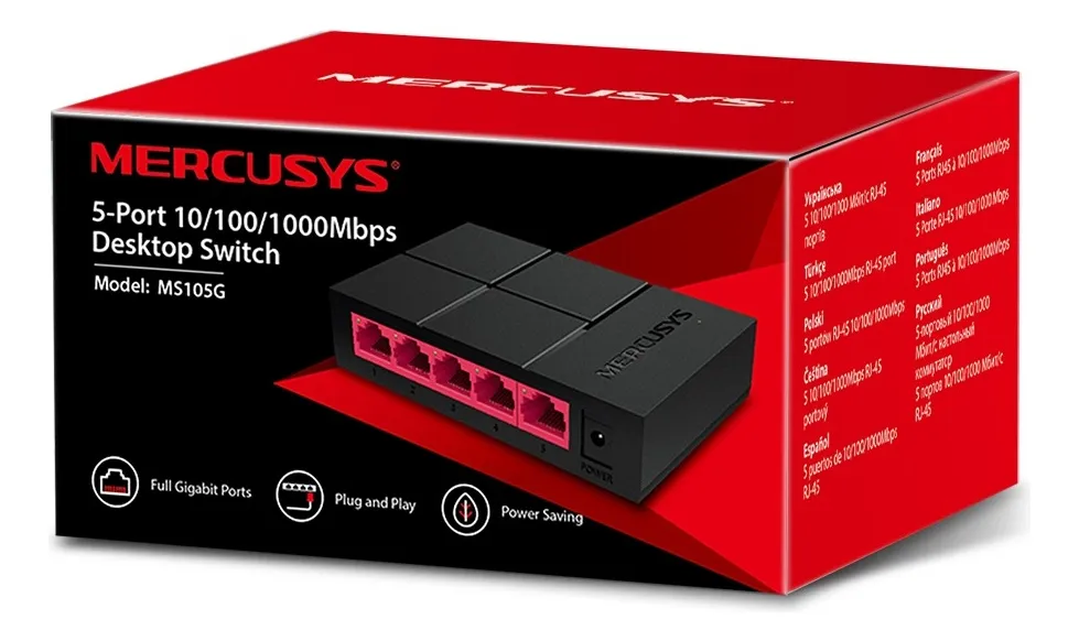 El Mercusys MS105G es el switch Gigabit de 5 puertos perfecto para hogares, oficinas pequeñas y estudios: transforma tu red en un instante con velocidades de hasta 1000 Mbps en cada puerto. Comparte archivos pesados, impresoras, Smart TVs, consolas y PCs al mismo tiempo con transferencia ultrarrápida y cero retrasos.