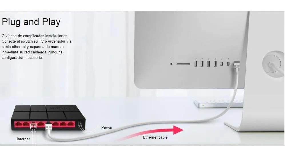 Diseño compacto y elegante, cabe hasta en el escritorio más pequeño. Instalación inmediata: conectas y listo (plug & play, sin configuración). Soporte auto MDI/MDIX detecta y ajusta automáticamente los cables.