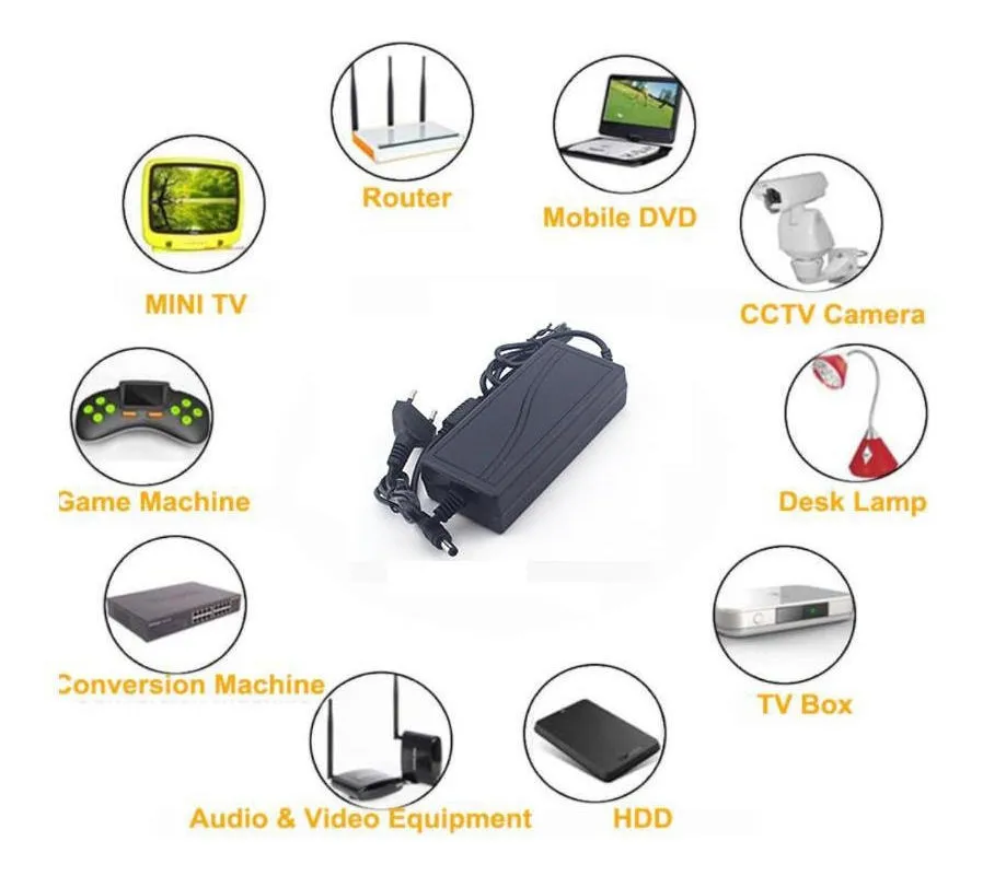 Adaptador AC a DC que entrega 12VDC hasta 5A. Ideal para cámaras de seguridad, cintas LED, routers, teléfonos y discos duros externos. Conector 5.5 × 2.1 mm (centro positivo). Entrada universal 100–240VAC.